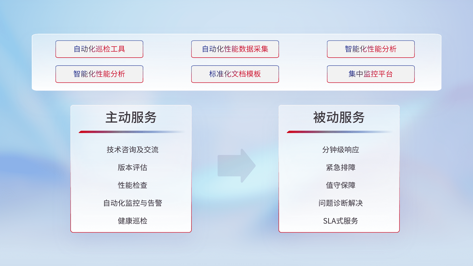 智能化工具和标准化文档,,,保障服务质量,,,,提供主动服务(包含技术咨询、、版本评估、、、性能检查、、、自动化监控与告警、、、健康巡检)和被动服务包含(分钟级响应、、紧急排障、、、、值守保障、、问题诊断解决、、SLA服务)。。。